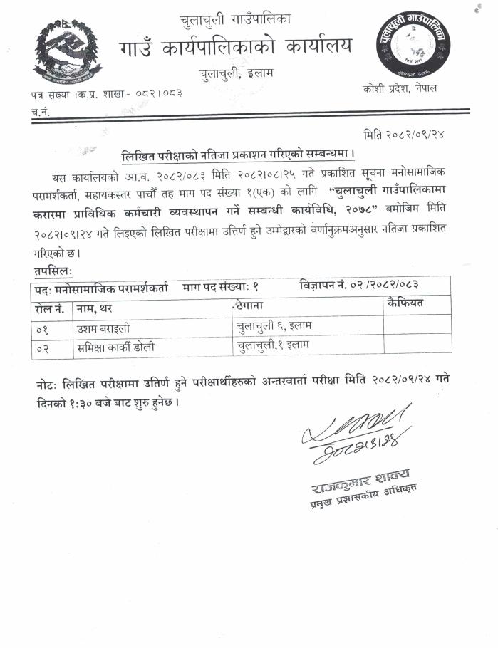 लिखित परीक्षाको नतिजा प्रकाशन गरिएको सम्बन्धमा।